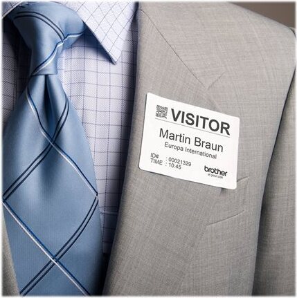 Brotherin DK11234-nimikorttitarra tekee vierailijoiden tunnistamisesta helppoa. Valmiiksi muotoiltu vierailijatarra voidaan kiinnittää turvallisesti suoraan vaatteeseen, sillä se ei jätä poistettaessa jälkeä. Voit tulostaa mustavalkoiselle tarralle vierailijasi nimen ja yrityksen lisäksi myös logon ja viivakoodin. Hyvä valinta vierailijoiden hallintaan toimistoissa ja erilaisissa tapahtumissa.