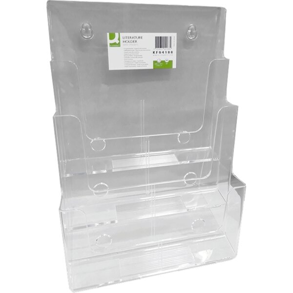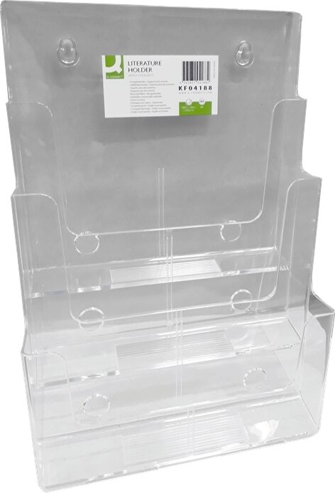 ProduktbeskrivningPöydällä pidettävä 3-lokeroinen esiteteline A4-kokoisille esitteille. Yhteen lokeroon mahtuu n. 3 cm nippu esitteitä. Koko L230xS120mmxK310 mm. Materiaali polystyreeni.